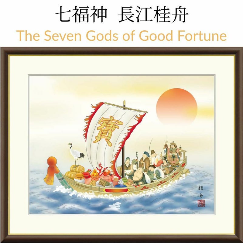 長江桂舟による「七福神」は、宝船に乗り吉祥を運ぶ七柱の神々を描いた縁起の佳品です。恵比寿・大黒天・毘沙門天・弁財天・福禄寿・寿老人・布袋尊が一堂に会し、それぞれの持つ福徳をもたらす姿が生き生きと表現されています。中央の大きな帆には「宝」の文字が金色に輝き、海上を進む宝船全体を祝福の象徴として際立たせています。船上には米俵や宝物が積まれ、富貴や繁栄の願いを重ね合わせています。背景の朝日が昇る様は新しい門出を暗示し、船首に立つ鶴は長寿を象徴。細部まで丁寧に描かれた構図は調和と賑わいに満ち、七福神が一斉に福をもたらす情景を華やかに伝えています。飾ることで、家庭や事業に福運を呼び込み、喜びに満ちた空間を演出する作品です。